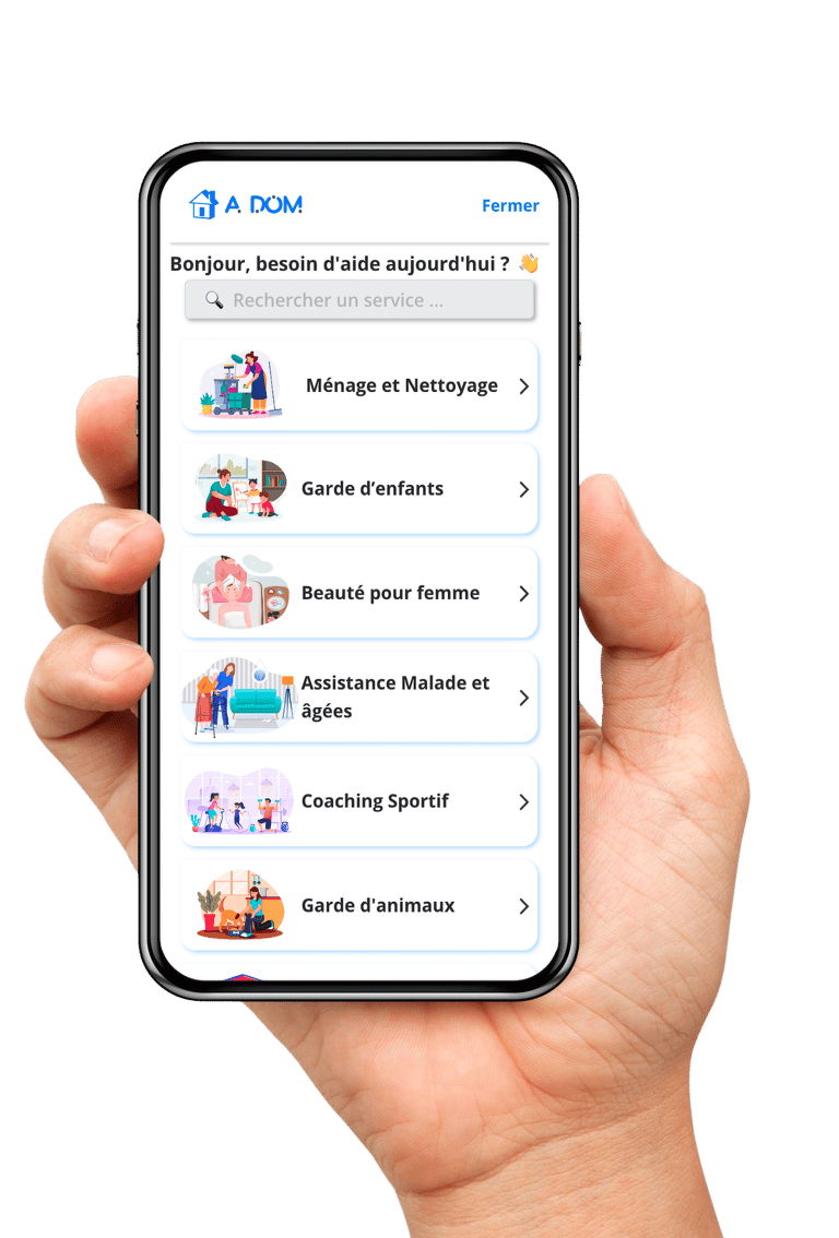 Adom facilite la recherche de services à domicile au Maroc en mettant en relation les utilisateurs avec des professionnels qualifiés. Notre plateforme vous permet de trouver facilement des experts dans différentes villes du pays, garantissant ainsi un service de haute qualité et fiable. Que vous ayez besoin d'un plombier, d'un électricien, d'une femme de ménage ou d'un jardinier, nous avons une large gamme de prestataires prêts à répondre à vos besoins. Grâce à notre système de mise en relation, vous pouvez rapidement trouver le professionnel adapté à votre demande, en fonction de vos critères de localisation, de compétences et de disponibilité. Ne perdez plus de temps à chercher, Adom s'occupe de tout pour vous.
